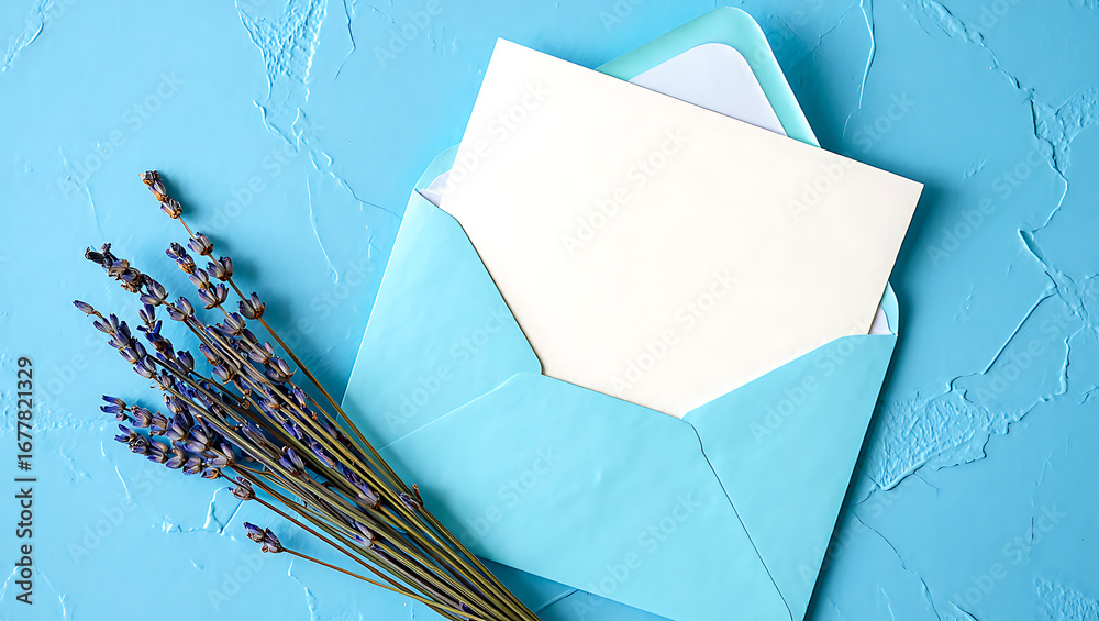 Open blue envelope with blank card and lavender Wallpaper