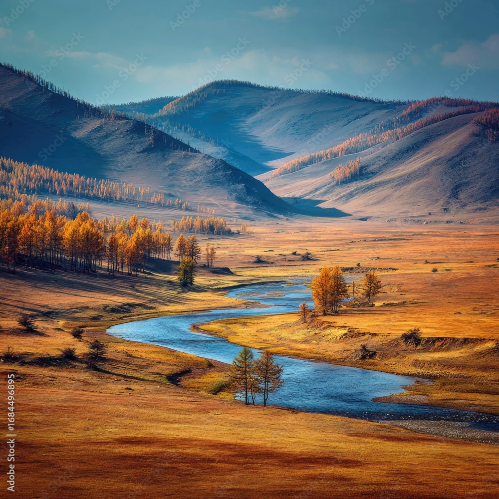 Serene autumn river meandering through a golden valley, surrounded by majestic mountains under a partly cloudy sky.