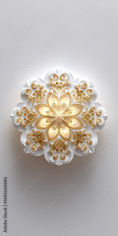 Ornate symmetrical floral design in white and gold illuminat Wallpaper