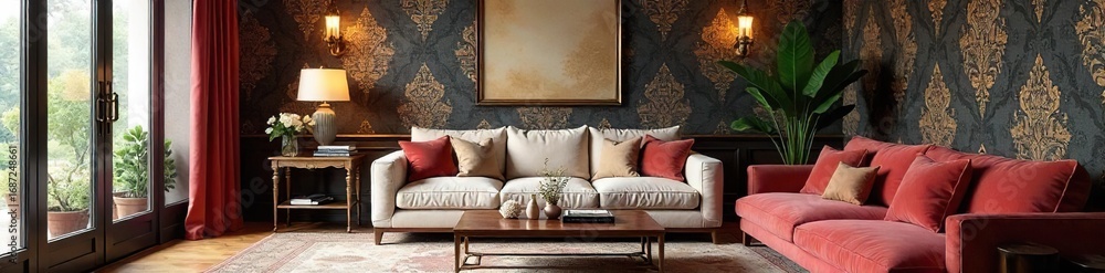 Luxurious Damask Patterned Wallpaper Adorns A Sophisticated Living Wallpaper Mural - Decorly Solutions | Decorly Solutions