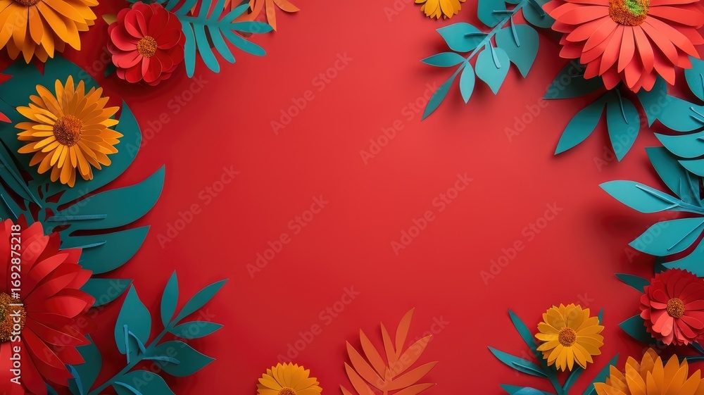 Vibrant paper flowers, blue backdrop, central space,  artwork,  floral,  empty space