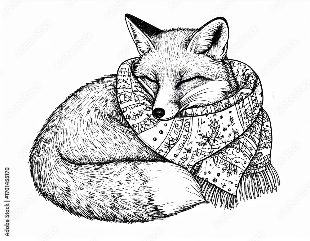 Fox Curled Up Wearing Scarf Black And White Wallpaper Mural - Decorly Solutions | Decorly Solutions