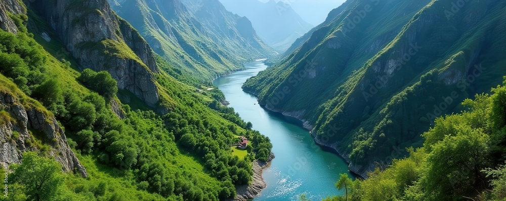 Lush green river canyon nestled between majestic mountains with selective focus on glistening water and distant fog-covered peaks in morning light