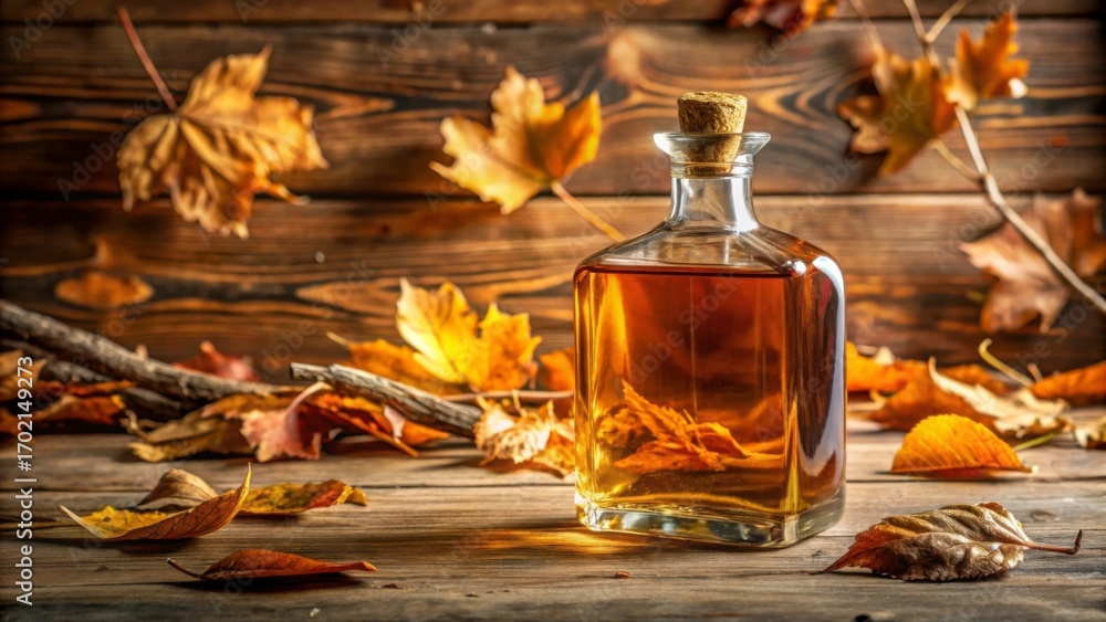 Glass Bottle with Golden Liquid Surrounded by Autumn Leaves Wallpaper