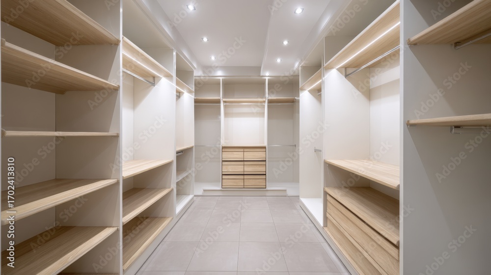Spacious Walk-in Closet With Custom Shelving And Drawers Wallpaper Mural - Decorly Solutions | Decorly Solutions