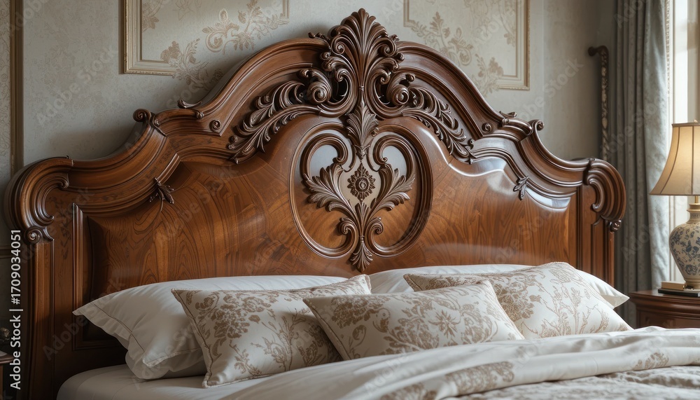 Ornate Carved Wooden Headboard in a Bedroom, Beautiful Home Interior Decor Detail