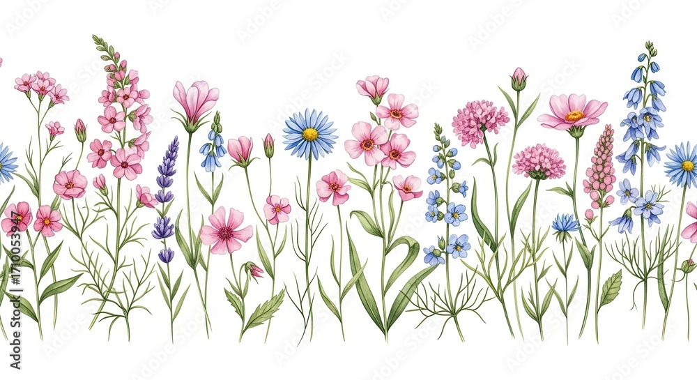 Delicate watercolor painting of a vibrant meadow filled with pink and purple wildflowers and green grass