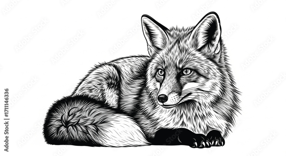 A detailed sketch of a fox lying down with its bushy tail cu Wallpaper