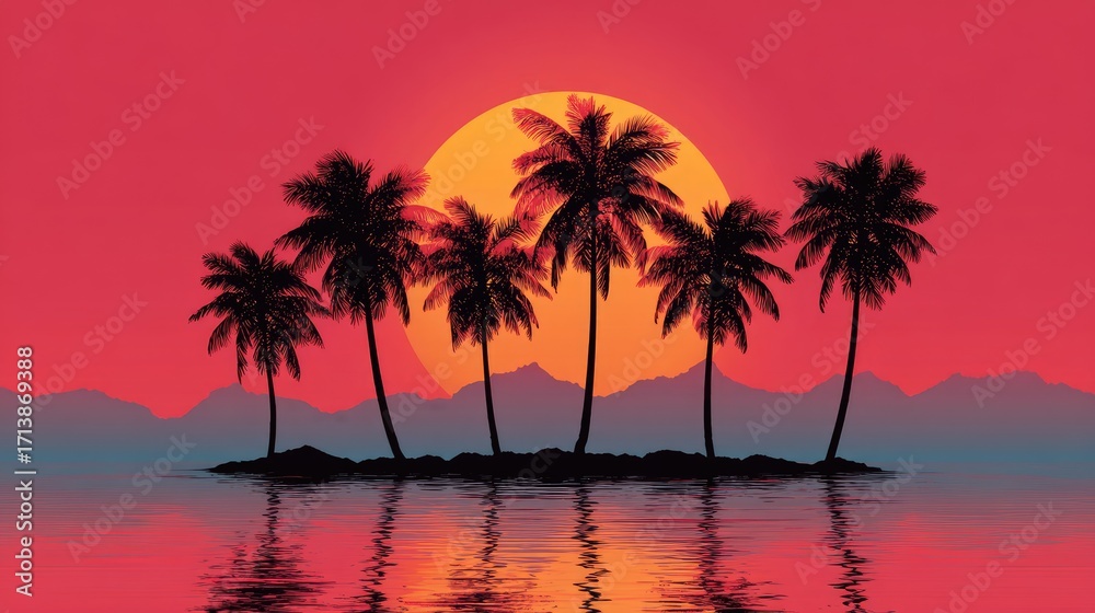 Silhouette of palm trees on a small island at sunset reflect Wallpaper