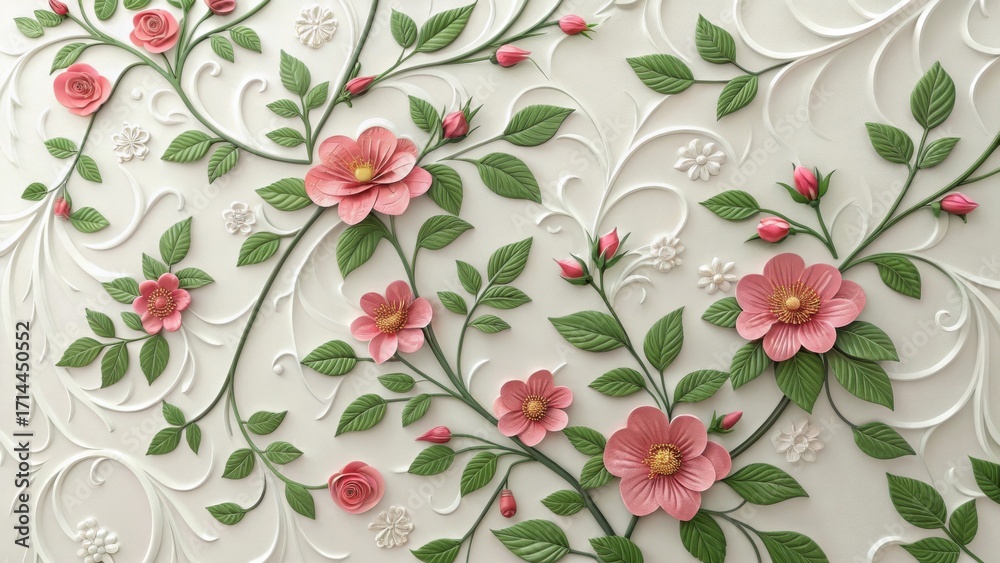Embossed Floral Pattern With Pink Roses And Green Wallpaper Mural - Decorly Solutions | Decorly Solutions