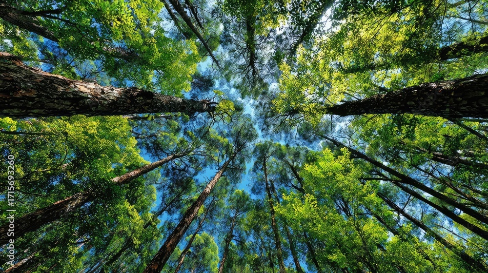 Trees in forest rising toward blue sky concept. A stunning view of towering trees and vibrant green canopy.