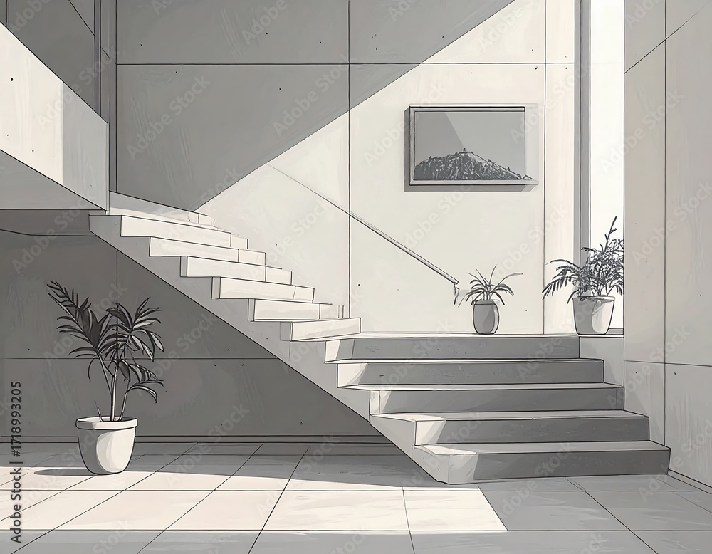 Modern Grayscale Interior With Stairs And Plants Wallpaper Mural - Decorly Solutions | Decorly Solutions