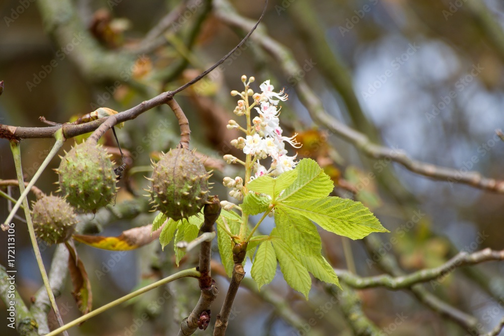 Confused chestnut tree with blossom and fruit together Wallpaper