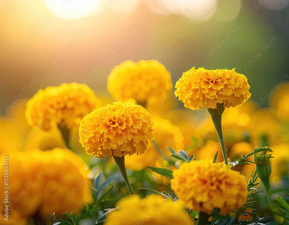 Vibrant marigold flowers bordering a warm sunset field Indian garden setting bokeh background