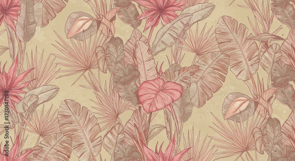 Vintage Botanical Wallpaper With Pink Leaves On Rustic Wallpaper Mural - Decorly Solutions | Decorly Solutions