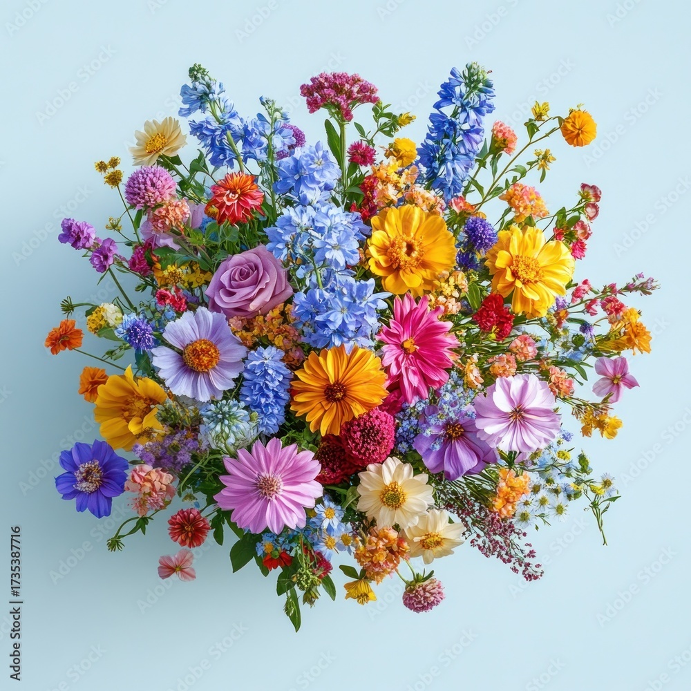Vibrant bouquet of various colorful wildflowers including yellow, pink, blue, and orange blossoms arranged against a light background