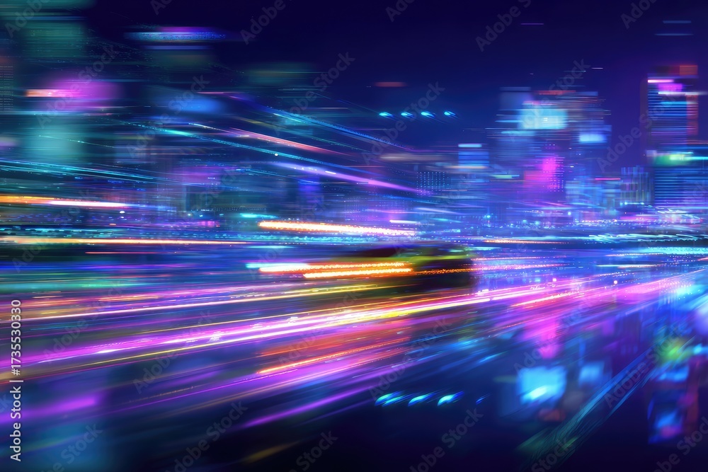 Abstract Cityscape,  Night Traffic Blurs into Dynamic Digital Streams of Light and Data, Reflecting Technological Advancement.