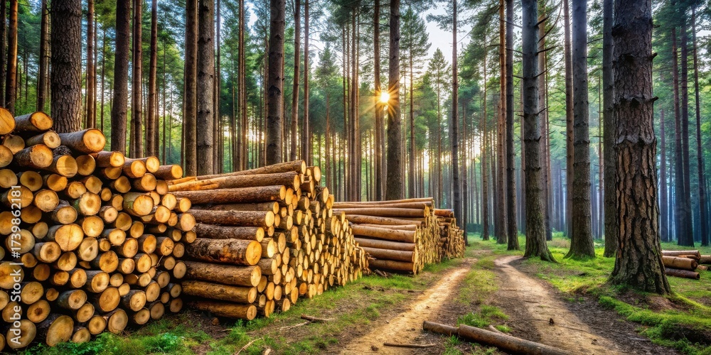 Misty Forest Path Flanked by Stacks of Harvested Timber Logs on a Serene Morning