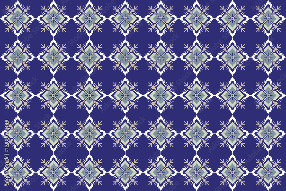 This fabric displays a repeating diamond-shaped pattern in white and light blue, set against a deep blue background.