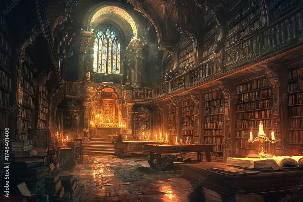Discover a stunning library interior with intricate architecture, warm lighting, and books that inspire a sense of wonder and serenity in this alluring space.
