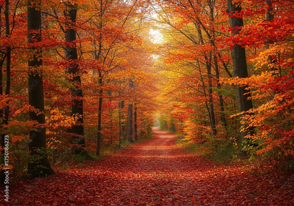 Path through a forest bursting with autumn hues, with leaves gently falling to the ground as the season changes