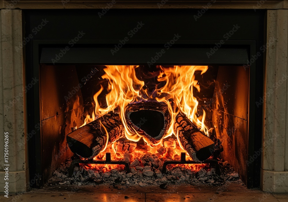 A cozy, crackling fire in a stone fireplace hearth, radiating warmth and comfort. Perfect for relaxation and home living ,hearth ,quiet ,rustic