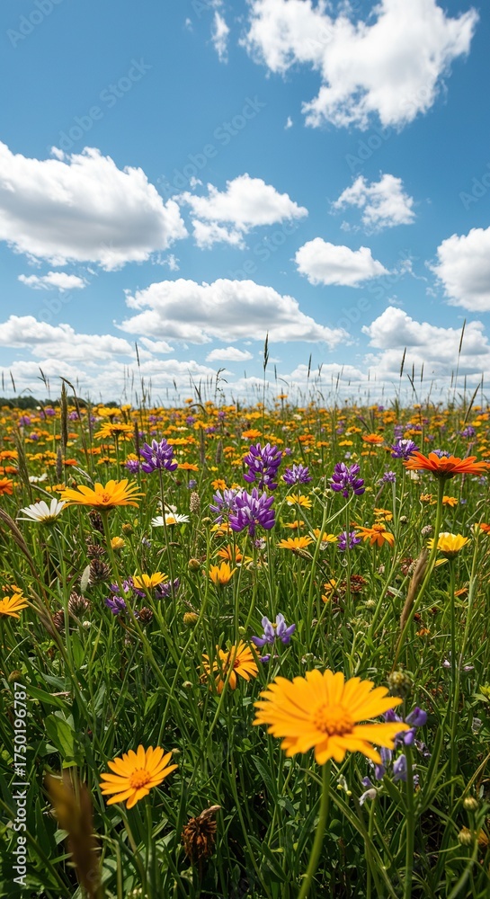 Vibrant wildflowers gently sway amongst lush green grass in a sun-drenched meadow, showcasing the beautiful harmony of nature's growth ,serene ,park ,green