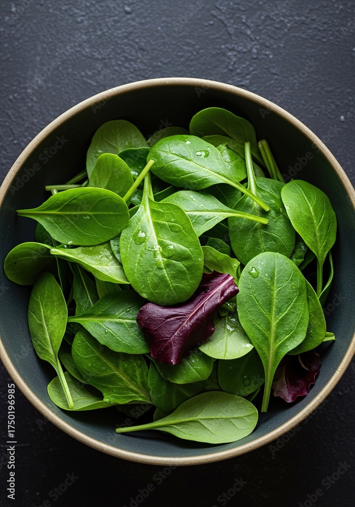 spinach salad green juicy leaves organic salad serving size natural top view copy space  for text diet raw food background rustic