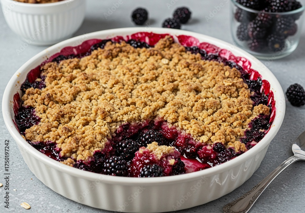 Warm, rustic blackberry crumble featuring juicy, dark berries beneath a golden, buttery oat topping, ideal for a comforting dessert ,tempting ,ripe ,textured