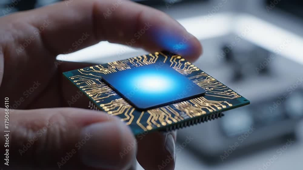 Artificial intelligence chip held in palm, future technology and innovation
