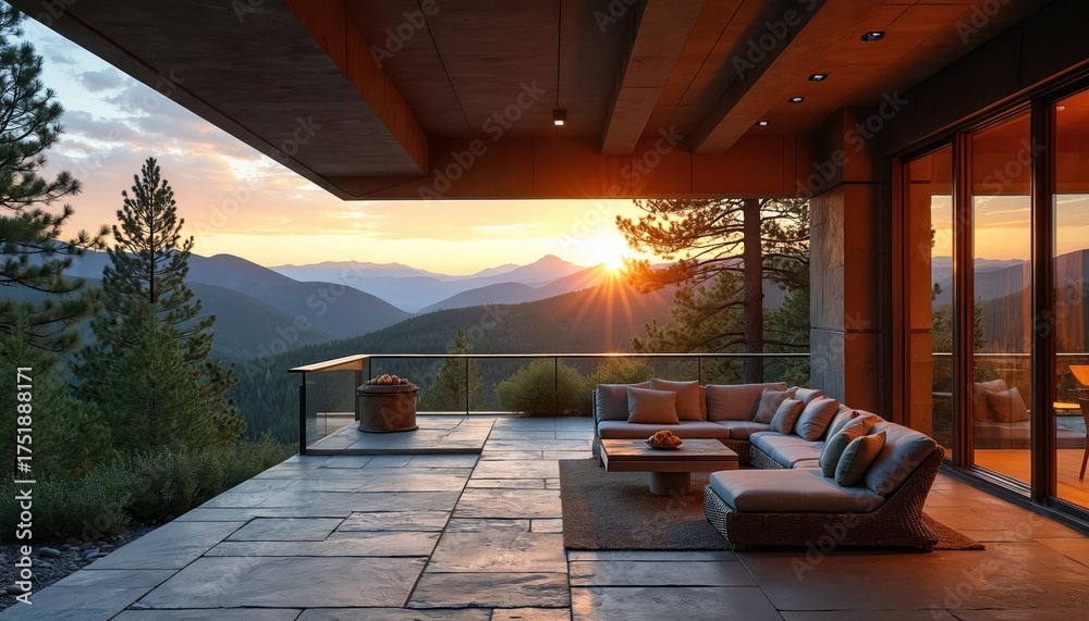 Modern mountain home patio features cozy sofa coffee table s Wallpaper