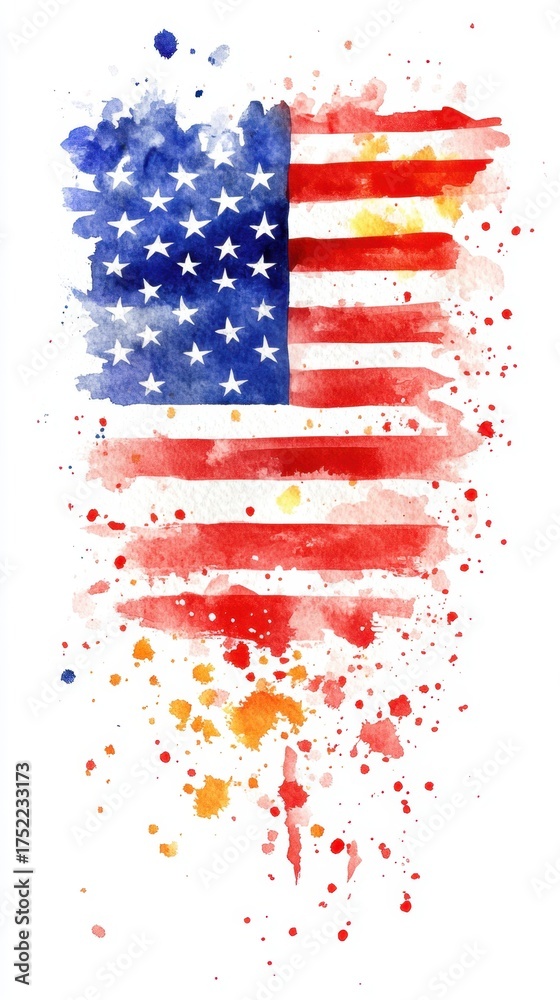 Watercolor USA Flag Independence Day Watercolor Art - A vibrant watercolor depiction of the American flag, symbolizing freedom, patriotism, unity, celebration, and national pride