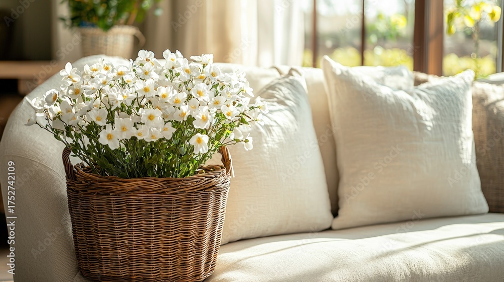 Cozy Living Room With Flowers And Pillows Sunlight Wallpaper Mural - Decorly Solutions | Decorly Solutions
