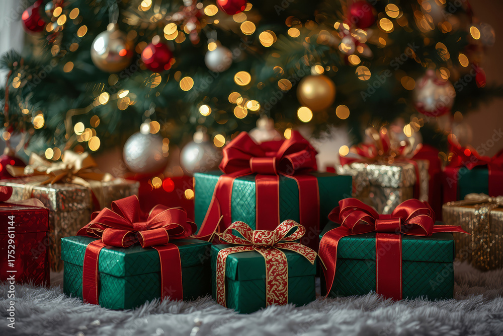 Pile of Christmas Gifts Under Decorated Tree with Bokeh Lights
