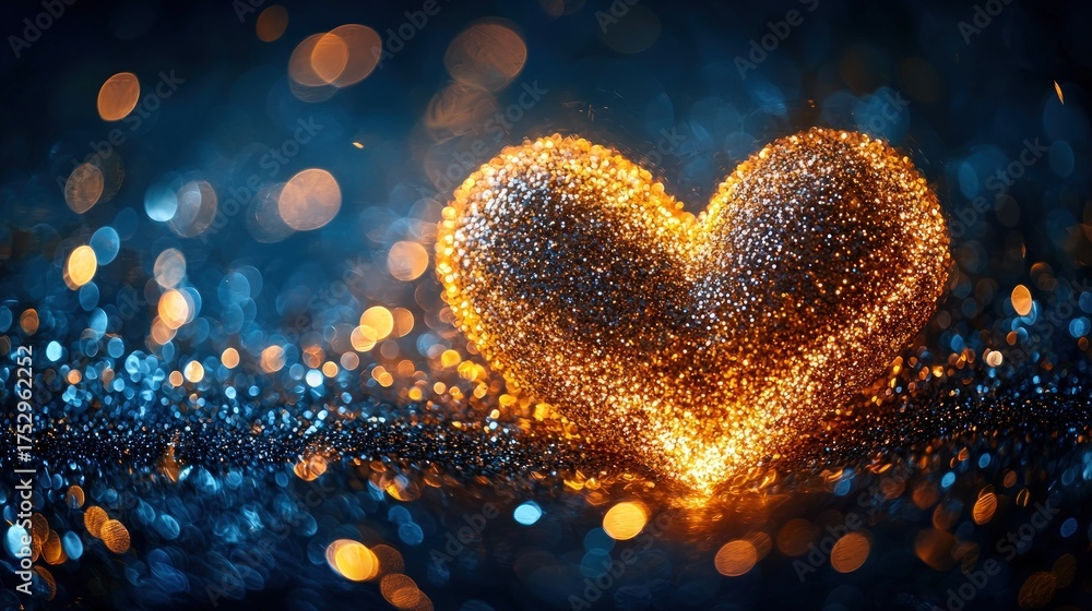 Golden Glittering Heart with Bokeh Lights on Dark Background.