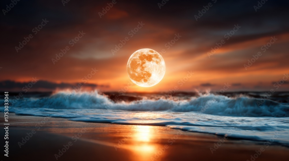 Beautiful sunset reflecting on ocean waves with a large moon illuminating the sky