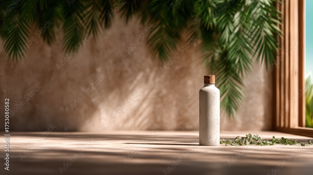 A minimalist bottle placed elegantly in a sunlit room surrou Wallpaper