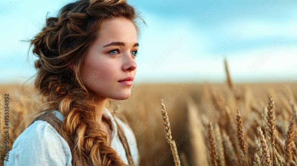 A serene portrait of a young woman with braided hair gazing Wallpaper