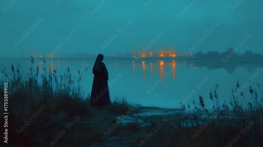 Serene Night Landscape with Silhouette by the Lake