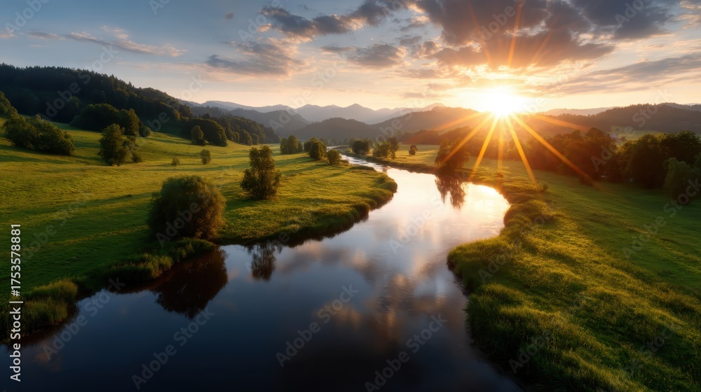 A breathtaking sunset illuminates the hills and river creati Wallpaper
