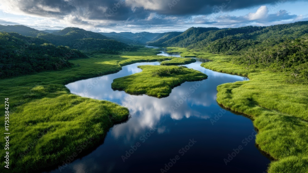 A Serene River Gracefully Winds Through A Lush Green Landscape, Capturing The Tranquility Of Nature And The Beauty Of Untouched Wilderness In A Stunning Panoramic View.