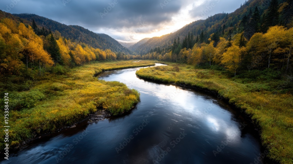 Scenic river flows through lush valleys and mountains during daylight hours