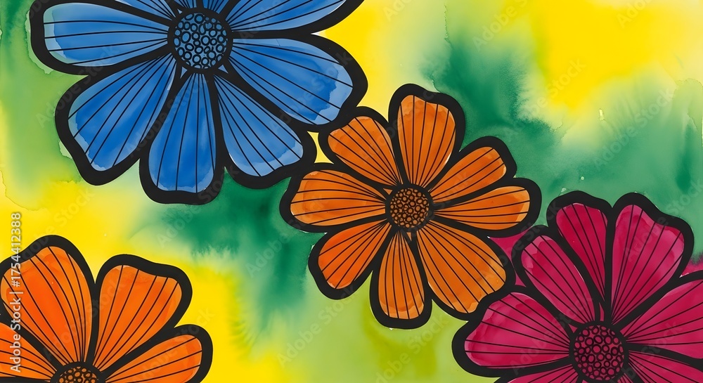 Vibrant colorful flowers with black outline on watercolor ba Wallpaper