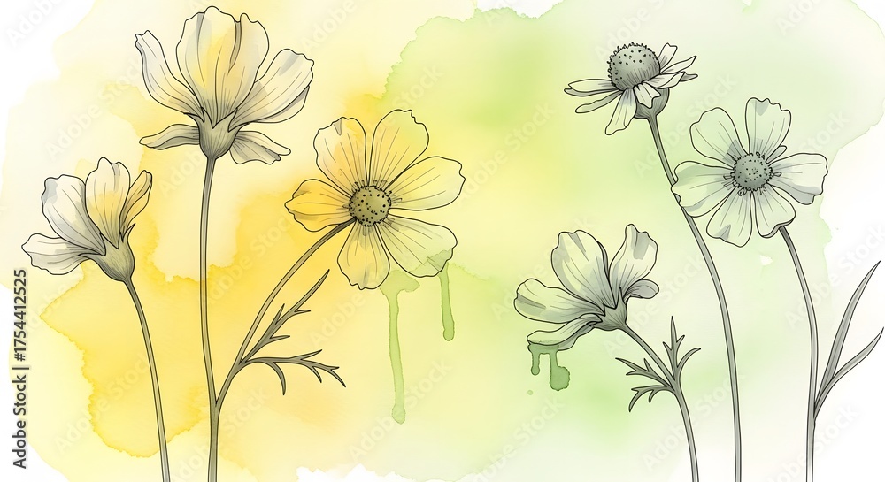 Delicate Line Drawing Of Cosmos Flowers On A Wallpaper Mural - Decorly Solutions | Decorly Solutions
