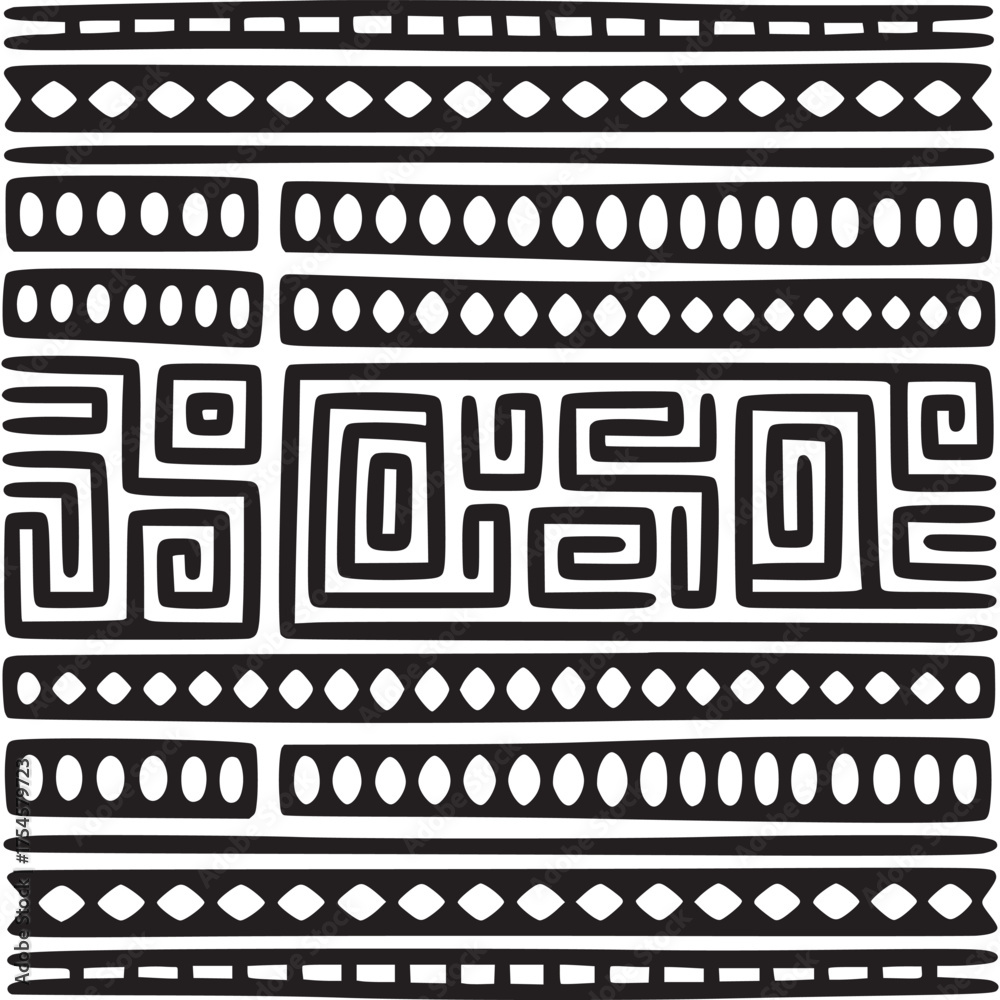 Tiki background design. Seamless ethnic and tribal pattern. Handmade. Horizontal stripes. Black-and-white print for your textiles. Vector illustration.