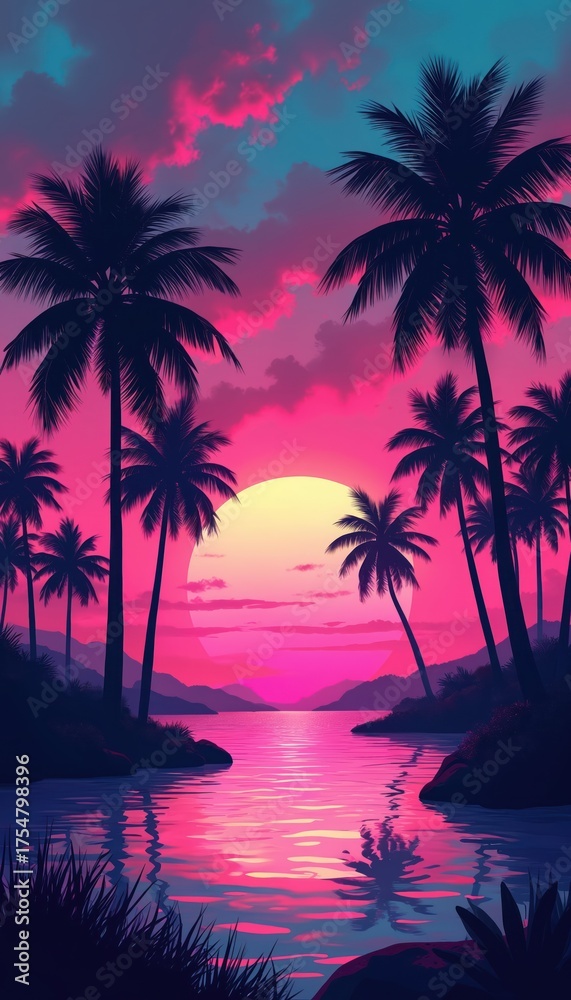 Retro Style Background Illustration Pink Sunset Reflects In Wallpaper Mural - Decorly Solutions | Decorly Solutions