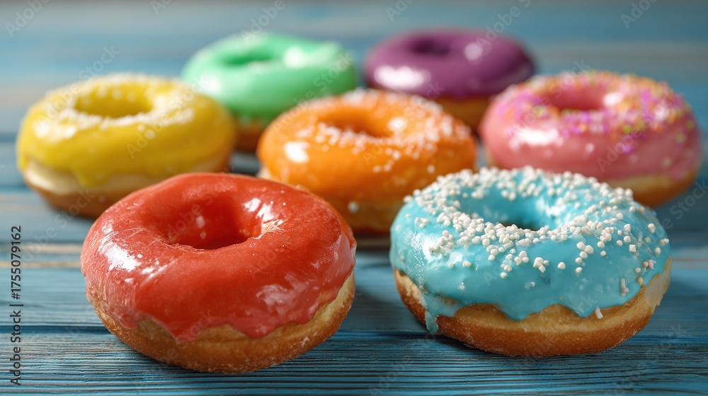 Delicious assorted donuts displayed on a wooden table with vibrant colors and toppings for everyone to enjoy