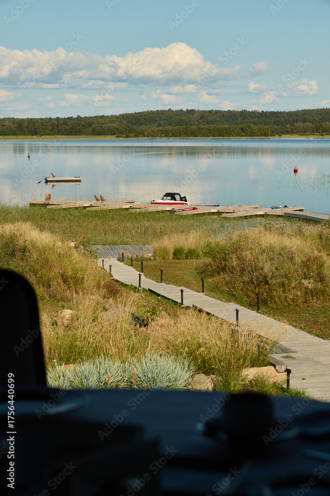 Calm Waters With A Scenic Dock Surrounded By Wallpaper Mural - Decorly Solutions | Decorly Solutions