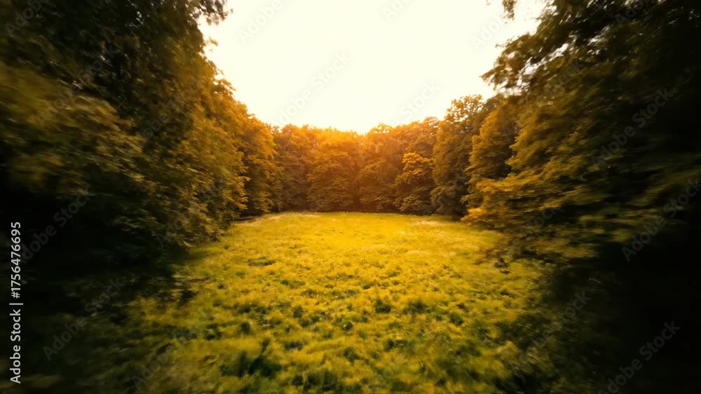 Slow aerial drone shot capturing a vibrant forest canopy at sunrise with golden light filtering through the trees landscape, establishing, high