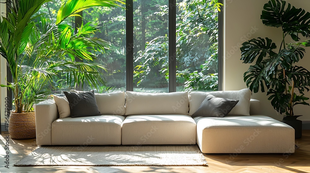 Sunlit Living Room With White Sofa And Lush Green Plants, Creating A Serene And Relaxing Atmosphere